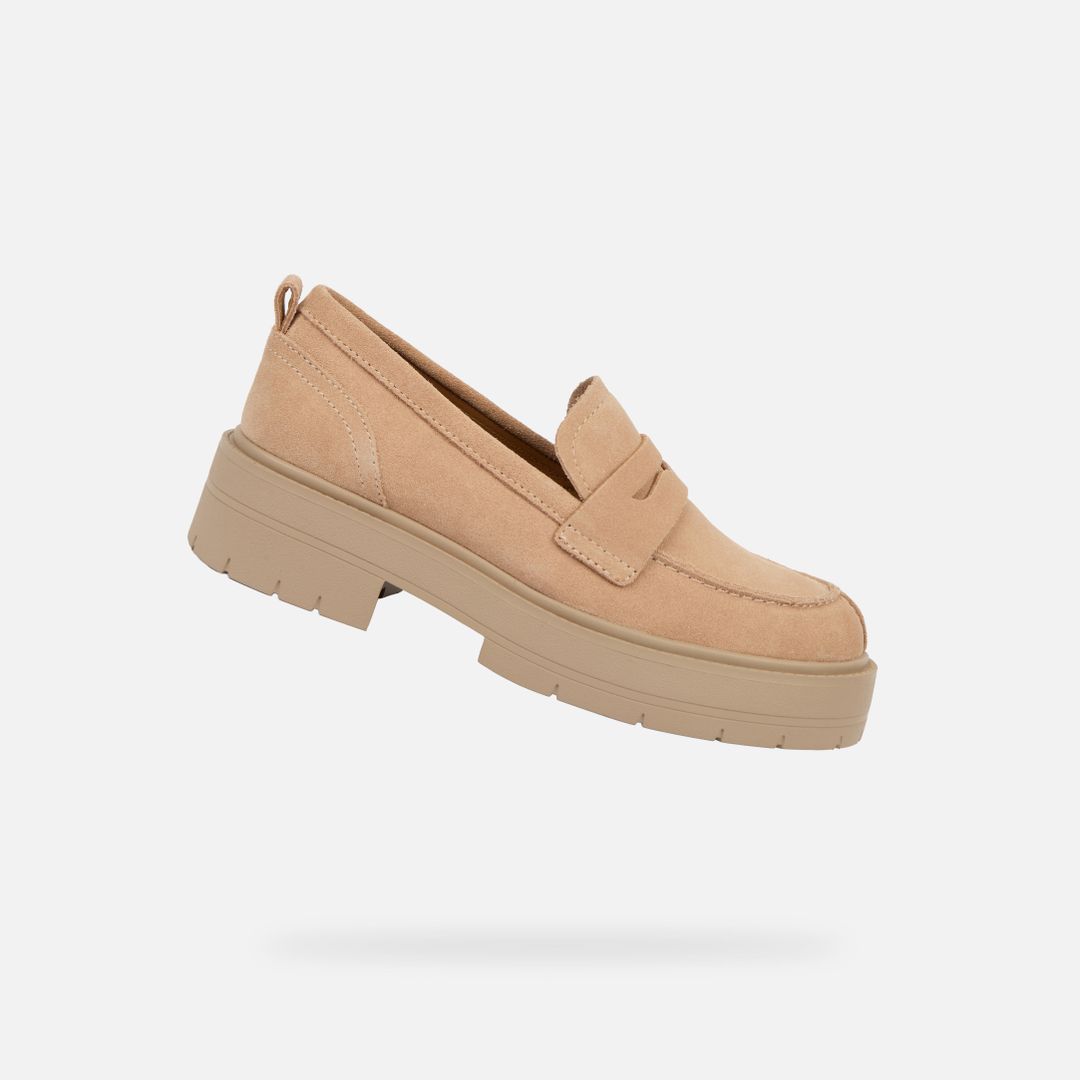 Beżowe damskie mokasyny Geox Spherica EC7 z grubą, platformową podeszwą. Klasyczne mokasyny w uniwersalnym beżowym odcieniu łączą elegancki design z nowoczesną technologią oddychania. Miękki zamszowy materiał i charakterystyczny pasek na cholewce nadają im ponadczasowy charakter.