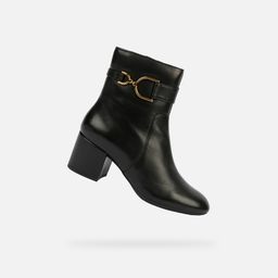 Czarne damskie obuwie za kostkę Geox Eleana z eleganckim designem i złotymi detalami. Minimalistyczny krój z połyskującą skórą i dekoracyjnym elementem w tonie złota dopełnia zarówno biznesowe stylizacje, jak i wieczorne wyjścia. Doskonałe dla Pań ceniących elegancję w codziennym noszeniu.