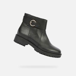 Czarne obuwie za kostkę Geox Hoara dla kobiet z elegancką klamrą i technologią Respira™. Botki z oddychającą podeszwą odprowadzającą wilgoć podczas długich dni w biurze i miejskich spotkań. Wysokość za kostkę zapewnia wsparcie stawu skokowego na nierównych powierzchniach.