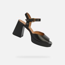 Czarne damskie sandały Geox Soledea z eleganckim obcasem na platformie i złotą klamrą. Zamszowa faktura i stabilny obcas block heel sprawią, że będzie je Pani mogła nosić podczas wieczornych kolacji, spotkań biznesowych czy rodzinnych uroczystości. Platforma dodaje wzrostu, a szeroka podstawa gwarantuje stabilność podczas chodzenia po nierównych powierzchniach.