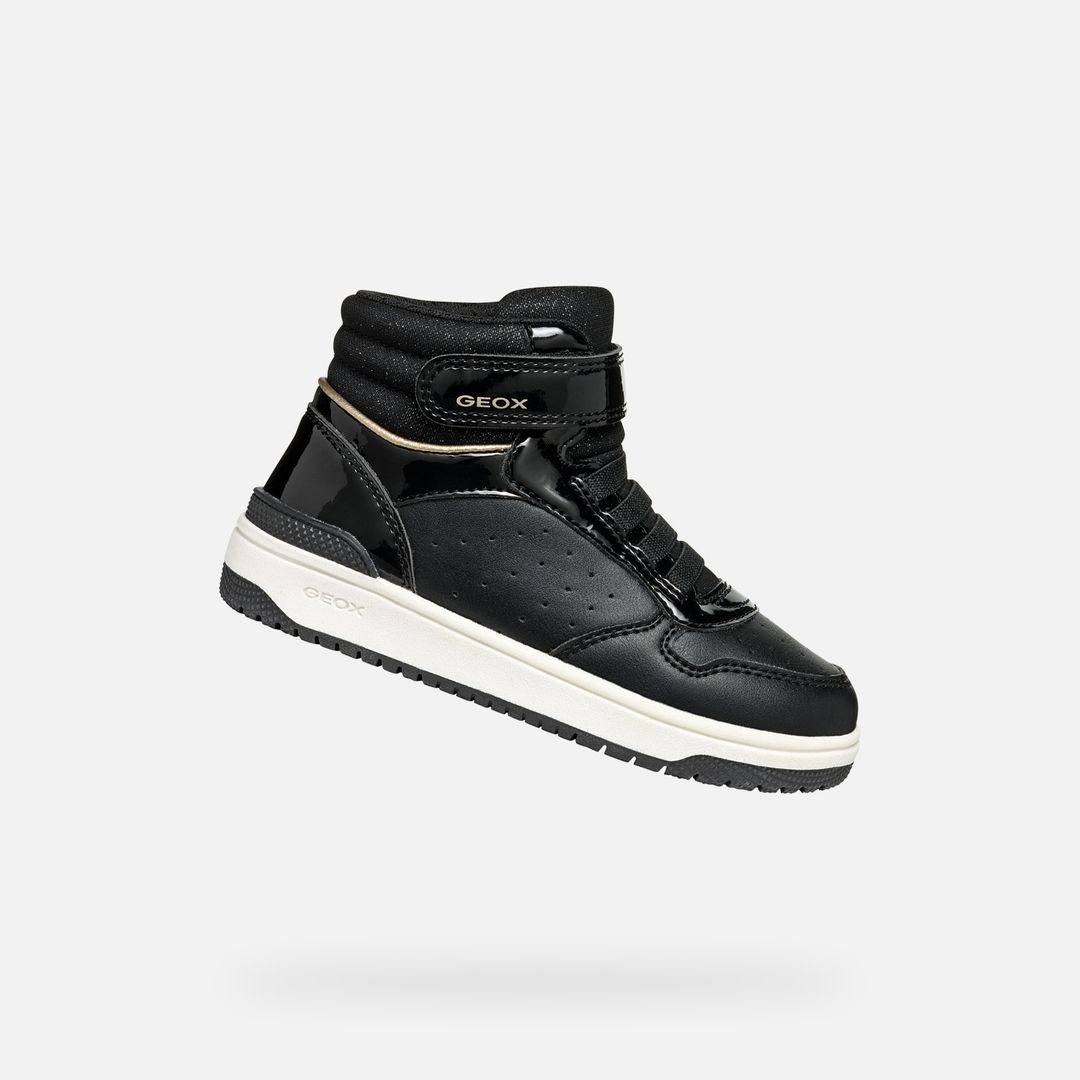 Czarne dziewczęce obuwie za kostkę Geox Washiba Girl z praktycznym połączeniem sznurowadel i rzepów. Buty łączą matową czerń z lakierowanymi akcentami, tworząc elegancki kontrast z kremową podeszwą. Złote logo Geox na rzepie dodaje subtelnego blasku całej kompozycji.