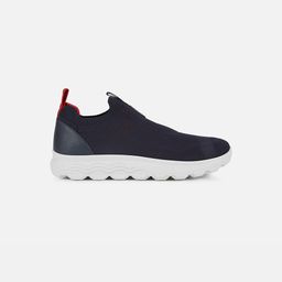 Smukłe granatowe wsuwane sneakersy Geox Spherica zachwycają nowoczesnym designem z wyrafinowanym dzianinowym wzorem. Charakterystyczną cechą jest czerwony pasek na pięcie i praktyczna pętelka na języku ułatwiająca zakładanie. Biała karbowana podeszwa nadaje butom sportowo-elegancki wygląd.