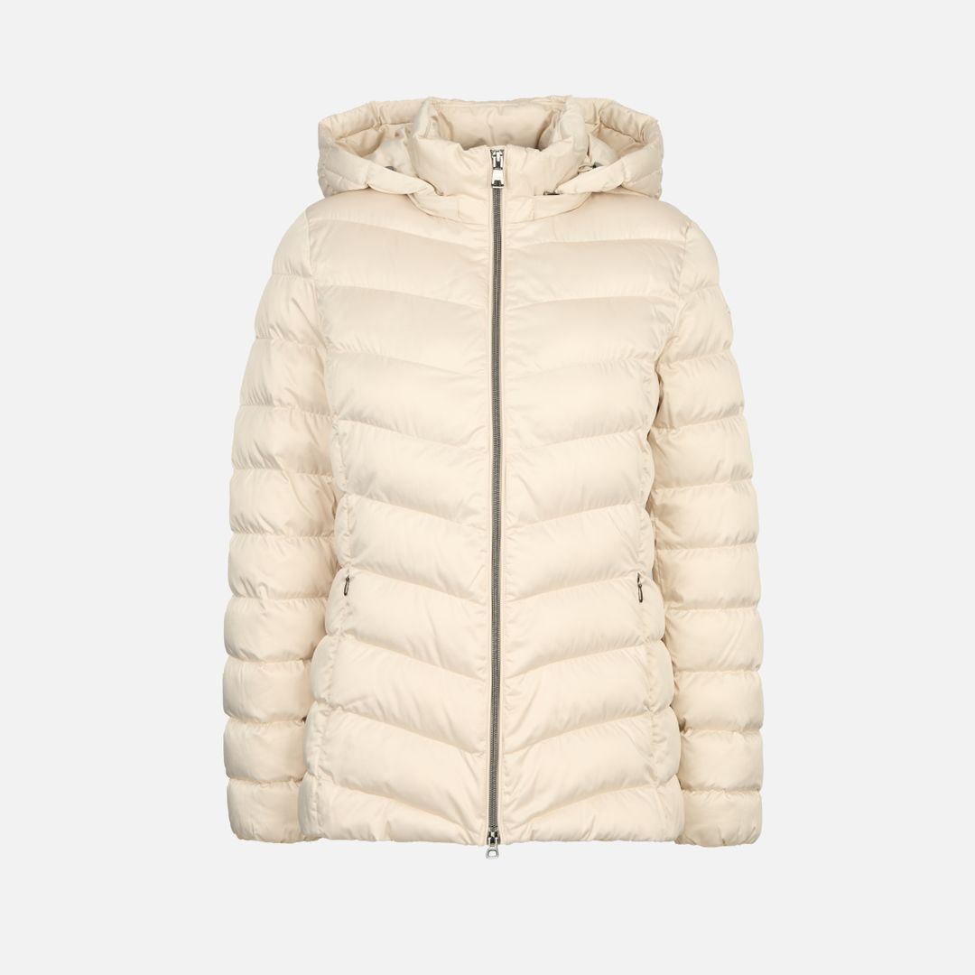 Kremowa damska puchowa kurtka Geox Zosma z kapturem i pikowaną strukturą. Elegancka kurtka o klasycznym kroju z praktycznymi kieszeniami na suwak i zintegrowanym kapturem. Sprawdzi się podczas jesiennych spacerów, zimowych wyjazdów służbowych czy codziennych obowiązków w chłodne dni.