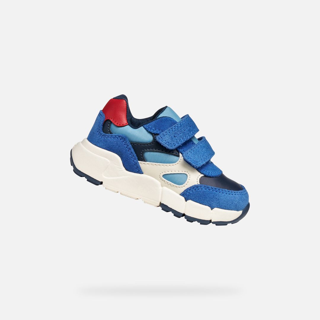 Niebieskie chłopięce obuwie na pierwsze kroki Geox Flexyper z praktycznymi rzepami. Sportowy design w kolorystyce niebieskiej z czerwonymi akcentami sprawdzi się podczas zabaw na placu i pierwszych samodzielnych spacerów. Ergonomiczna konstrukcja została stworzona specjalnie dla dzieci stawiających pierwsze kroki.